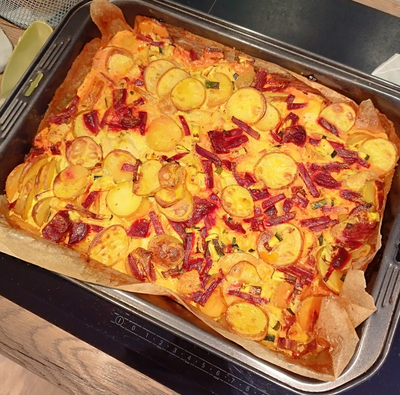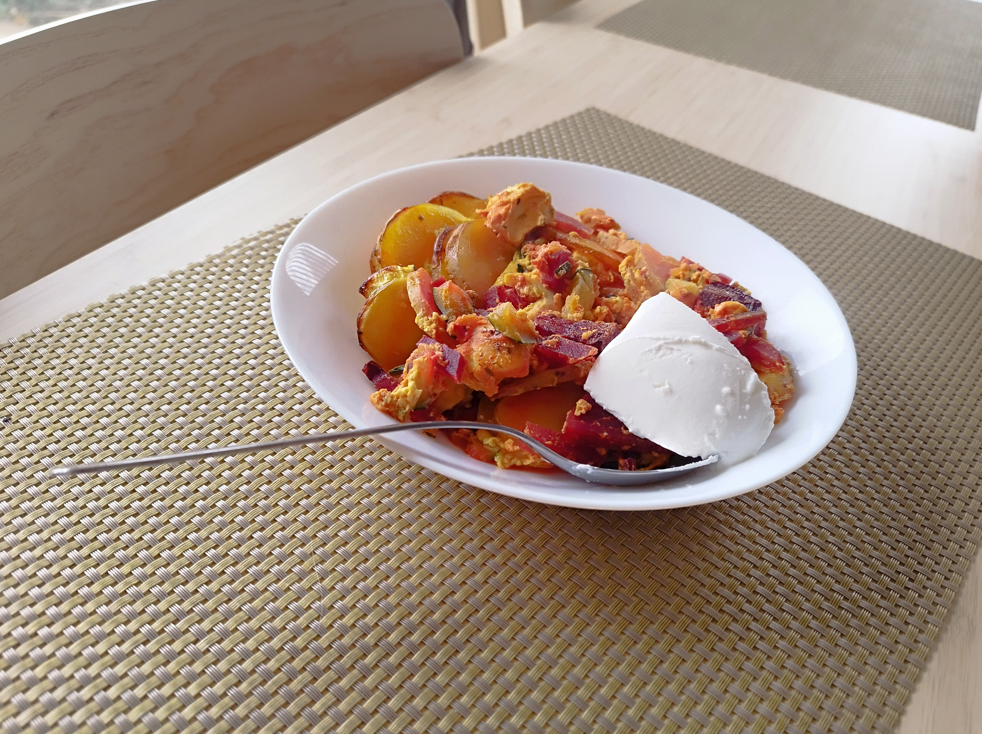Nakrájíme si na kostky či proužky zeleninu. Můžete si zvolit z uvedených libovolně, které máte radi. Já v tomto receptu použila brambory, cuketu, cibuli, červenou řepu a žlutou/červenou papriku, často přidávám i mrkev. V pekáči promíchám s vejci, dávám cca vejce na osobu. Přidám na kousky nakrájené krůtí/kuřecí maso, můžete použít i vepřové, nebo tempeh/tofu. Olivový olej, koření červená paprika, sušený česnek, kurkuma, oregano a sůl. Na závěr vše zaliju plechovkou kokosového mléka.